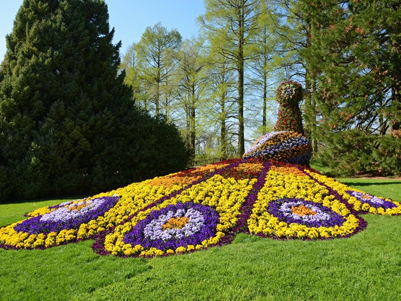 Vi tar plats i bussen och följer Bodensjöns södra strand till Konstanz och blomsterön Mainau. Mainau behöver i dag inte någon närmare presentation efter de populära filmserier och reportage som visats i TV. Vi vill gärna påpeka, att det alltid är säsong på Mainau. Det är alltså inte bara på våren som det blommar. Blomsterparken, drivs och planeras, för att det alltid ska vara växter som blommar från april till oktober: 380 000 sommarblommor, palmer, rosor, bananer, citroner, apelsiner, ett palmhus med underbara orkidéer och mycket annat i blomsterväg. Allt detta skapar en sydländsk atmosfär. Här frodas inte mindre än 1 200 olika arter och 20 000 blomsterplantor. Mainau är inte bara blommor och träd, utan de olika byggnaderna är också sevärdheter i sig. Slottet, där greveparet bodde, är byggt på 1740-talet och i kyrkan St Marien kan vi se många vackra målningar.