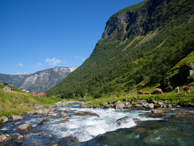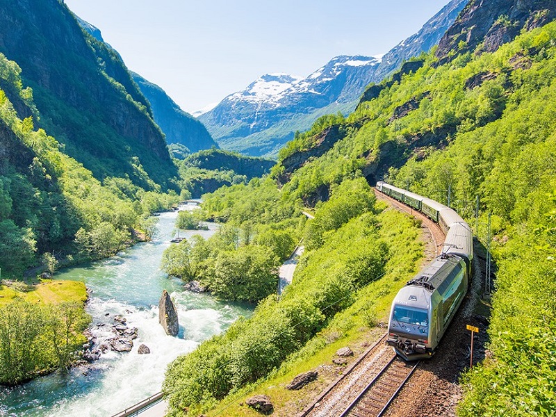 Idag väntar en spännande resa med Bergensbanan samt Flåmsbanan. Vi åker med tåget från Gol till Myrdal. Redan efter Geilo öppnar sig landskapet och tåget börjar äta sig allt högre upp på bergets sida. Under en timme färdas vi över det dramatiska landskapet, genom tunnlar och över broar. Bergensbanan har utsetts till en av världens vackraste tågresor. Den mest spektakulära sträckan går över Hardangervidda, den högsta bergsplatån i Europa. Vi passerar Finse, 1 222 meter över havet och kommer fram till Myrdal där vi byter till den berömda Flåmsbanan. Den 20 km långa Flåmsbanan har 21 tunnlar med en sammanlagd längd av 6 km, höjdskillnaden är 864 meter från Myrdal till Flåm. Flåmsbanan är ett mästerverk i järnvägsbyggande som stod klart i början av 1940-talet. Den är en av Norges största och mest kända attraktioner. Väl nere i Flåm, som ligger vid en av världens längsta fjordar, Sognefjorden, stiger vi ombord på en snabbåt för en fjordkryssning på Aurlandsfjorden/Sognefjorden till Balestrand under ca 1,5 timme. Armarna av fjorden är de vildaste och mest storslagna sidoarmarna till Sognefjorden omgiven av branta och höga berg som sträcker sig 1500 meter över havet, vattenfall, små gårdar och byar. Vi checkar in och äter middag på vårt fantastiska hotell i Balestrand. Ca 2 mil