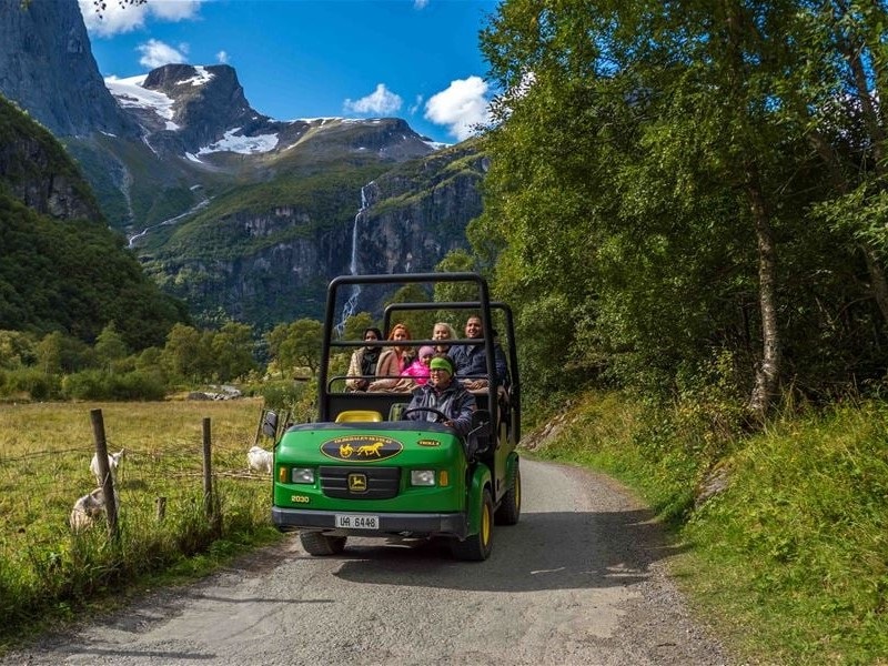 Ett lugnt alternativ till huvudvägarna är att åka på Norges 18 Nationella turistvägar, som är körning genom vacker norsk natur. Upplevelsen förstärks med nyskapande arkitektur och tankeväckande konst på arrangerade utsiktsplatser och rastplatser. Gaularfjellsvegen öppnade 1938 och är en väl bevarad hemlighet för de flesta. På rastplatsen ”Utsikten” kan vi njuta av utsikten över ett frodigt och vackert landskap där vägen slingrar sig uppför backen. Den följer Gaularvassdraget, en av få skyddade vattendrag som erbjuder allt från vilda forsar och vattenfall till lugna partier där vattnet tyst rinner bort. En tur över den fjädrande bron Likholefossen ger upplevelsen av att befinna sig mitt i det bubblande vattenfallet. Vid Förde viker vi norrut och fortsätter längs Innviksfjorden i den vackra dalen längs forsar och sjöar och kommer in i Briksdalen. Här byter vi vår buss mot jeepar som längs slingrande småvägar och vackra vattenfall ska ta oss till Briksdalsglaciären som tyvärr har minskat i omfång vilket visas tydligt genom de skyltar som indikerar gränser för dess storlek under tidigare år. Vi kommer fram till glaciärens blåskimrande ismassor som klättrar nerför de nakna klippväggarna. Vi får njuta av den på lite avstånd vid strandkanten av en smältvattensjö. Färden fortsätter på vackra vägar förbi Stryn till det mer än 100 år gamla, mysiga Grotli Högfjällshotell. Ca 30 mil