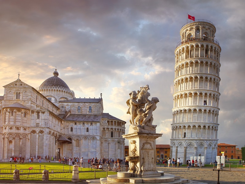 Vi tar ett direktflyg på morgonen och landar kl. 12.35 i Pisa. Vi tar bussen in till Pisas berömda medelpunkt, Piazza del Miracoli, Domkyrkoplatsen, med domen, baptisteriet och kampanilen, det vill säga det lutande tornet. Domen är ett av den italienska arkitekturens mest typiska exempel på romansk byggnadsstil och grundades år 1063. Vi fortsätter sedan österut till Montecatini Terme, där vi skall bo i fyra nätter på Grand Hotel Panoramic, ett mysigt hotell som ligger på norra sidan av parken Terme och som serverar äkta toskansk mat. Montecatini Terme är Italiens äldsta och mest populära kurort, belägen vid foten av bergskedjan Apenninerna. Romarna var de första som utnyttjade de varma källorna, men först på 1700-talet blev platsen känd, då den österrikiske hertigen av Toscana lät öppna en kuranstalt. Många typer av behandlingar kan idag beställas på någon av de många termerna. Ca 6 mil