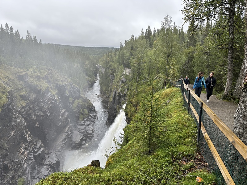 I närheten av Vildmarksvägen ligger flera vattenfall där delar av filmen om Ronja Rövardotter och Dunderklumpen spelades in. I Gäddede finner vi en utställning som visar bygdens natur och kultur i historia och nutid. Här kan man göra ett ”provkryp” i Korallgrottan, studera områdets djur och naturliv samt lära sig om same- och kulturhistorien som finns i området. Även en film om hur man beter sig vid björnmöten och i Fjällparken kan vi se ett urval av de fjällväxter som finns i Frostviken. Vi fortsätter längs Ströms Vattudal ner mot Strömsund. Detta är en vacker sträcka med ett pärlband av små och stora vattendrag som lockar fisketurister från hela världen. Vi anländer till Hällingsåfallet - Sveriges längsta kanjon och vårt svar på Grand Canyon, bara några kilometer från den norska gränsen. Här störtar Hällingsån utför ett stup på närmare 45 meters höjd. Ett fantastiskt naturfenomen att se vattenmassorna kasta sig ut över klippstupet, en oförglömlig upplevelse. Fallet som ligger nära vägen har en fin spångad led som går utmed Hällingsånsravinen. Vi lämnar Vildmarksvägen vid Strömsund och kör den sista biten ner till Östersund för middag och övernattning. 37 mil